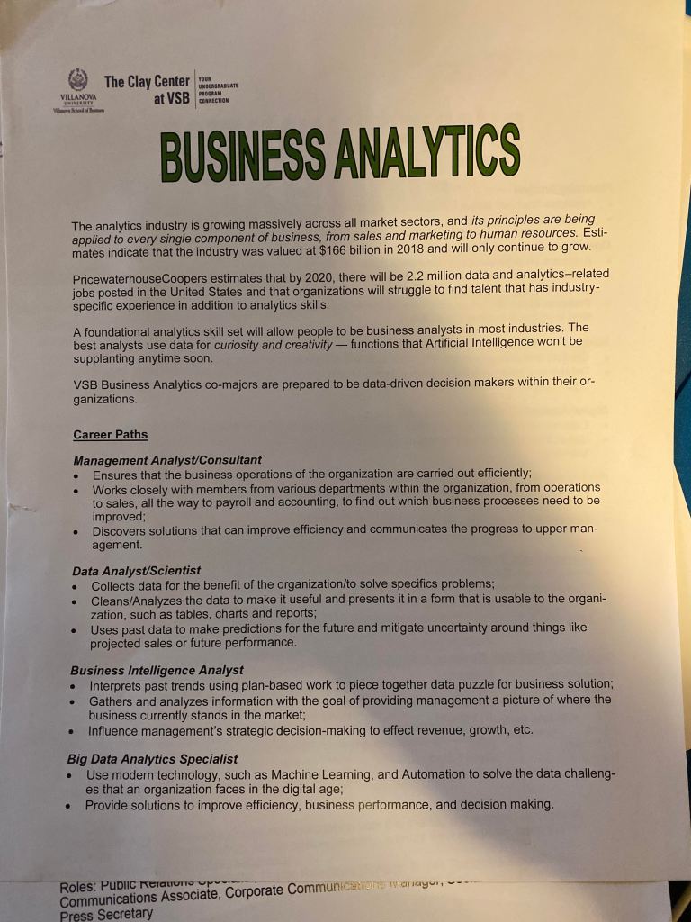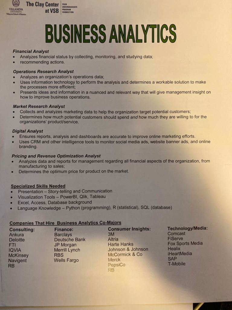 I have finally reached that point in my life where it is time to think about the future. It feels like just last week I was in high school worrying about what college I was going to get into, and now I’m already looking ahead to majors and career opportunities. Although I am just one semester into my freshman year at Villanova University, it is never too early to look ahead. I recently attended the Majors Fair that took place in Bartley Hall. I had the opportunity to meet with many faculty and department chair members as they explained to me the different majors, co-majors, and minors that are offered at the school. Unlike many of my peers, I went into the fair having little idea of what interested me for the future. One thing was clear to me: I always enjoyed analyzing numbers and data, which lead me to the business analytics table. I got the opportunity to talk to a senior in the business school who is currently taking Business Analytics as a minor. She told me about the many classes that are offered that dive deeper into the topic as well as the potential jobs that could come out of it.